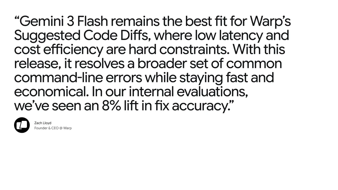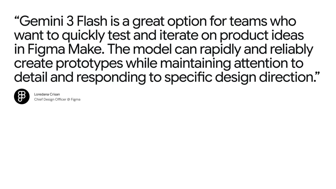 Gemini 3 Flash를 사용하는 기업들로부터 폭발적인 반응을 얻고 있습니다. JetBrains, Bridgewater Associates, Figma와 같은 기업들은 이미 Gemini 3 Flash를 활용하여 비즈니스를 혁신하고 있으며, 추론 속도, 효율성 및 추론 능력이 대규모 모델과 동등한 수준임을 인정하고 있습니다. Gemini 3 Flash는 Vertex AI와 Gemini Enterprise를 통해 지금 바로 기업에서 이용할 수 있습니다.